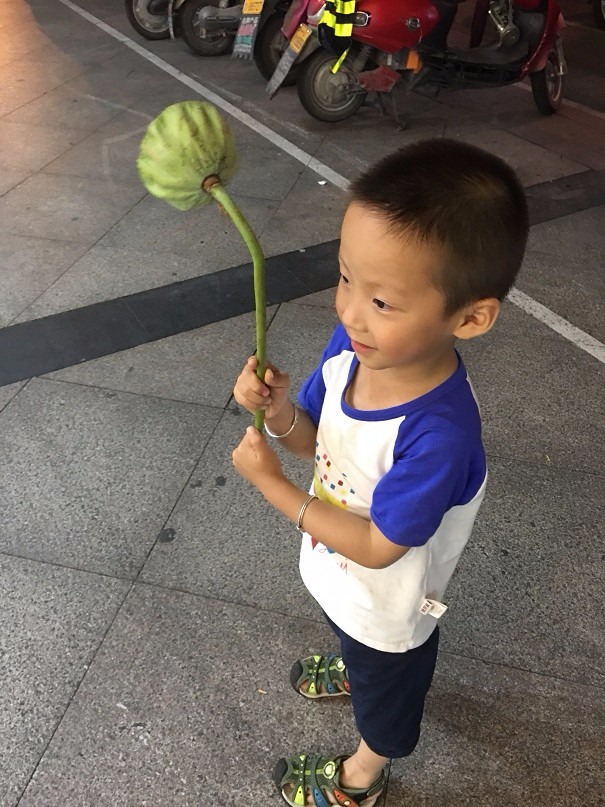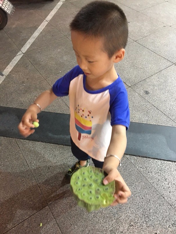 昨晚上宝贝去上画画课,七点半结束之后,宝贝说想吃馄饨,于是我们就去了。路上正好看到有卖莲蓬的,宝贝看着问我这个是什么?我说这是莲蓬,里面有莲子。它长在水里有藕,有荷叶,有荷花,然后还有这莲蓬。说起这些宝贝就知道这是什么了。去年的时候,我们也买过好几次。五块钱三个左右。不过今年一问这价格还真是有些贵呀。稍微大一点点的要五块钱一个,小一点儿的十块钱三个。宝贝选了一个大的。莲子吃吃还是好的,清热去火的。