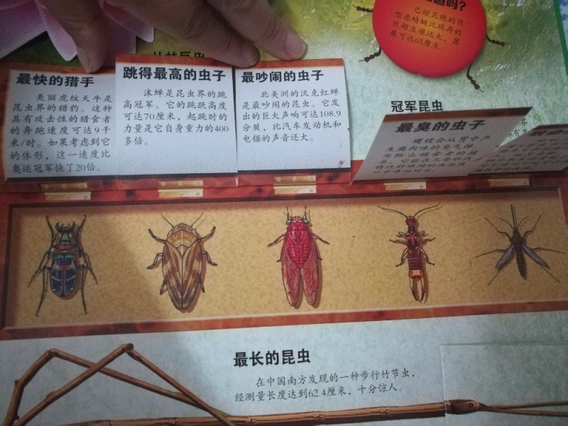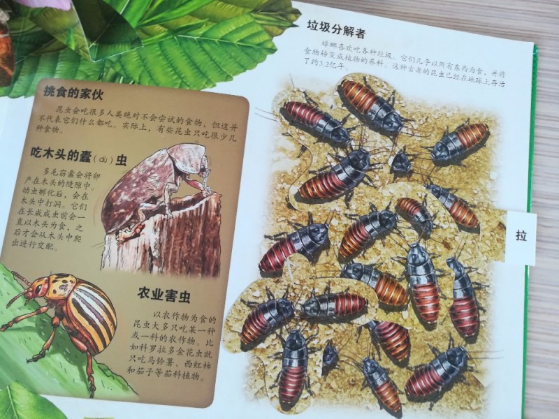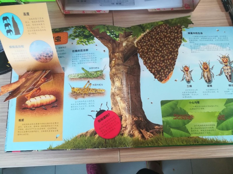 这本书里面有竹节虫,介绍了蜜蜂,不同品种的,还有蝗虫,这才知道,原来蝗虫的颜色不同,绿色和黄色,原来不是天气原因造成的不同颜色,而是因为独居和群居的区别的,真的是涨只知识了。不仅仅孩子喜欢这本书,我也是非常的喜欢的,可以边玩边学还能够学到科普知识,实在是值得入手的一本书。