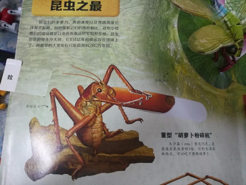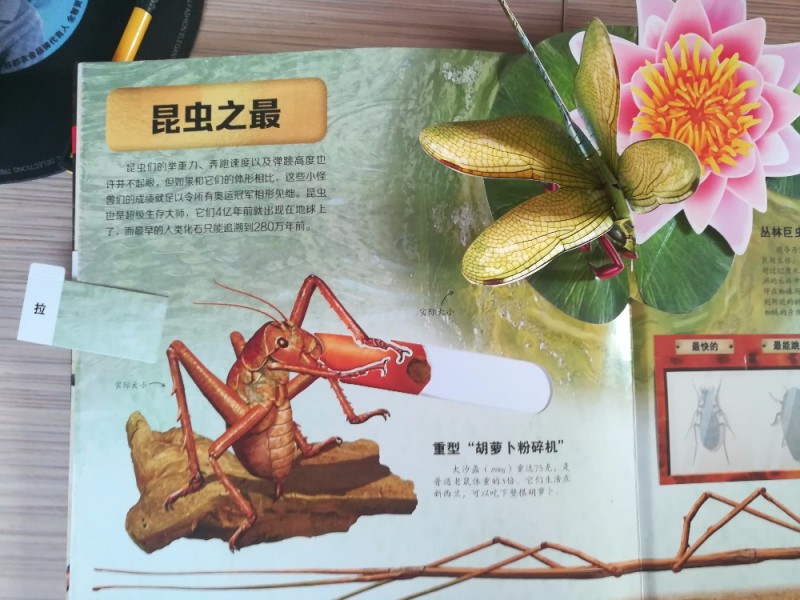 真是是立体书,本来我以为就是有立体图形,孩子翻看的时候,才发现还有其他的小秘密,还有有的可以翻看,隐藏了起来;还有的是可以转圈的,这一圈之中,不知不觉就讲解了一个小昆虫的一生;还有的是可以拉出来、推进去的,就像这本书中的,大沙螽,一开始我就是觉得有趣,而在我还没有看内容的时候,儿子就说这个胡萝卜是这个昆虫吃的,哈哈,孩子的观察力确实是比我们好啊,我都没有注意到,孩子就发现了,儿子还问我这是什么昆虫?我看了之后,告诉他这是——大沙螽,爱吃胡萝卜。嘻嘻,女儿就说:我是小白兔,爱吃胡萝卜。哈哈,真的是蛮搞笑的孩子啊。