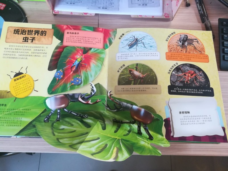 我能说我即使参加过分享,看到这本实物立体书的时候,还是觉得非常的震惊,太过于精美了,看着就是非常的好喜欢的啊。这本书带回家之后,两个孩子问我是什么?告诉他们是书,本来孩子还有些不以为然,翻看后,立马非常的惊喜,觉得这样活灵活现的立体书很有趣。这时候,我就发现男孩女孩到底是不同的,女儿抓着书上的蝴蝶不松手,说要看,说喜欢;而儿子,看的是甲虫,两个孩子都是非常的喜欢,看着我心惊胆战的,生怕他们的“争夺”会弄坏书本。