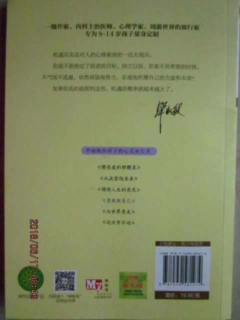 这是一本专为孩子写的心灵成长全书,是激励孩子们勇敢进步的指导之书,假如遇到了困境,读一读这本书,就会增加克服困难的勇气,风平浪静的日子里,阅读这本书,也会积聚能量,受到启迪,阅读毕老师的书,非常利于孩子们茁壮地成长。