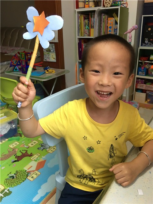 宝贝拿着剪刀就开始操作了,一点点的小心翼翼的沿着边线剪出来,又找来了双面胶,认真的在制作。我就安静的在旁边看,让宝贝独立完成吧。宝贝各个部分剪的不错,基本上都没有留白,偶尔一两处稍微有一点点的剪多了。一开始卷那个棒的时候有点儿不大会,我就稍微给他示意了下后,宝贝就明白啦。接下来的其它各个部分都是独立完成的。做好后,看起来还不错,和参考图对比下,几乎也很接近啦。做好后的“精灵棒”可以拿来当道具喽,嘿嘿…… ![]() ![]() ![]() ![]() “精灵棒”在宝贝手里就成了巴拉巴拉小魔仙里的魔法棒。“巴啦啦能量……” 嘿嘿,蛮有趣。平时宝贝偶尔会看这部动画片,喜欢里面的小蓝姐姐,美琪,美雪,她们代表着正义,用魔法帮助别人。宝贝拿着精灵棒来回的比划着,还自言自语的自创咒语:“超级无敌魔法棒,变变变……”开始自导自演的开始嗨起来啦。 ![]() 老师布置的小手工作业完成啦,“精灵棒”在宝贝手中它成了一个有趣的小玩具,小道具呢。 ![]()