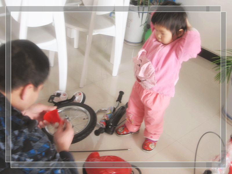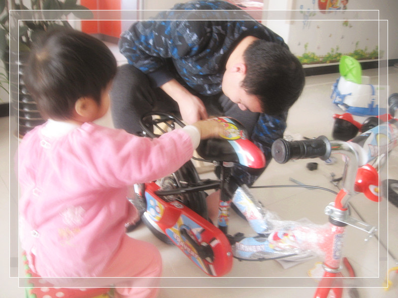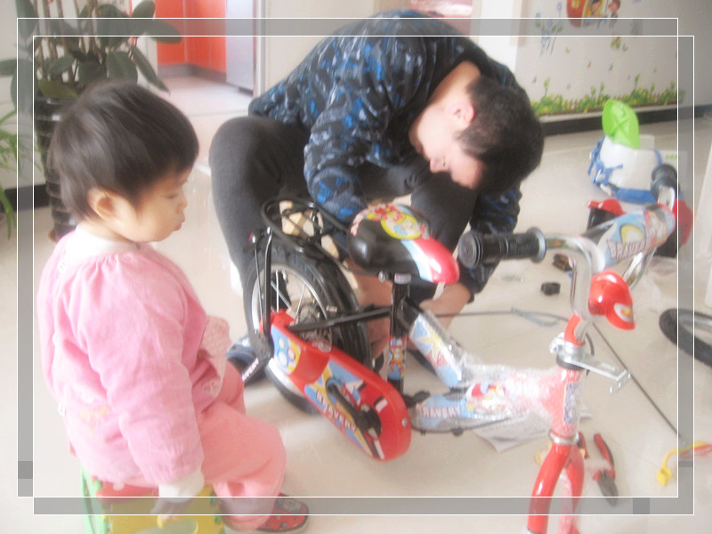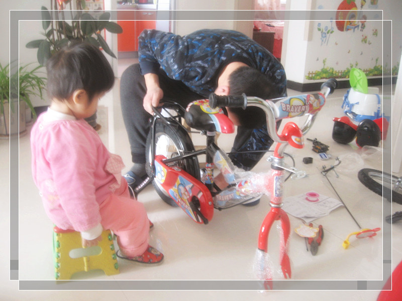 年前活动的奖品,可是一直放在阳台上没有拆开。放年假了老公也有时间了,于是便催促着他赶紧把自行车装好,这样宝宝就可以骑了。妞爸一直说,宝宝现在骑不了,车子有些大。可是我却固执的认为,宝宝骑应该可以,而且总放在阳台不是太浪费了。妞爸拗不过我,这不今天开始拆箱装自行车了,妞妞一看这架势,她跟着爸爸忙前忙后弄开了,跟在爸爸的PP后面,一会拿这个,一会儿又拿那个,妞爸都要叫妞妞给搞晕了。