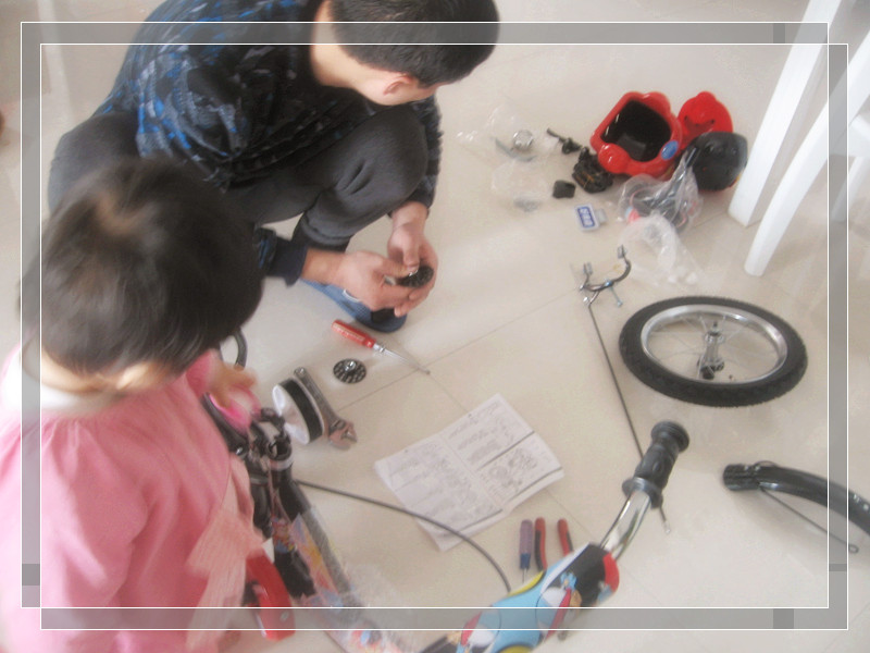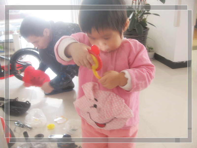 这个东西都是看着简单,可是真的操作起来还是蛮费神的。什么螺丝啊,顺序呀,反正要我肯定是要搞的头晕了,还好有妞爸,人家慢条斯理的,居然把这些零零散散的东西装到一起,而且顺序什么的都不会错,真是服了他了。小妞很听话,转着圈的围着爸爸,小嘴里不停的叨叨“爸爸给妞妞把小自行车弄起来喽~”,“妞妞可以骑自行车啦~”。妞爸觉的妞好笑的不行,在他旁边不停的打转,嘴里还不停的说,搞的他一点脾气没有,只能冲着闺女傻傻的笑笑。呵呵,这下也要让他尝尝他家妞的厉害~ ![]() ![]() ![]() ![]() ![]() ![]() ![]() ![]() ![]() ![]()