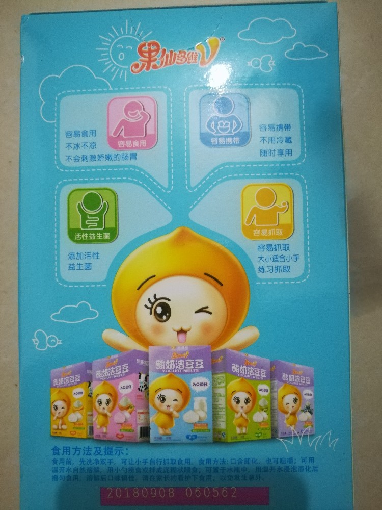 这酸奶溶豆豆的口味有5种,原味、草莓味、柳橙味、蓝莓味喝猕猴桃的,我这次随机收到的酸奶溶豆豆口味是原味的,外包装是蓝色的,女儿一直都是很喜欢蓝色的,这原味的溶豆豆是白色,女儿问我为什么不是蓝色溶豆豆,O(∩_∩)O哈哈~。这款酸奶溶豆豆一盒是18克,分成了4小袋,这样刚好两个孩子一人两袋,也省得他们有争抢的。4小袋上面的小人儿图片,还是非常的可爱的,表情很可爱,外包装上面也有,而且看着就跟我们的孩子似的,各种调皮捣蛋的表情都有。