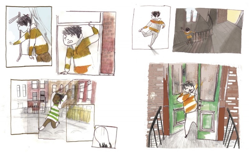 幸运的是,这颗种子恰恰给了男孩一个转变的契机。 这天,男孩靠在窗边把玩种子,一不小心,种子掉了下去,被一个跳绳的小女孩捡走。女孩的出现似乎标志着全书基调的变化:灰暗、浑浊的画面中开始多了一丝明朗。女孩身上跳动的色彩、洋溢的乐观情绪,都让人眼前一亮。而接下来,在男孩穿过街区、寻找女孩身影的路途中,我们几乎可以听见前半部分低沉喑哑的曲调变成了轻快悠扬的小提琴声,情不自禁地跟随男孩一起,用惊喜的目光打量周围未曾注意过的景象:咖啡馆外惬意的人群,理发店里呼呼大睡的顾客,水果摊的老板会和气地打招呼,街头的餐馆飘散出诱人的香味。看,地上还有一枚幸运硬币!男孩用硬币买了一块香喷喷的蝴蝶酥,踱到广场上。在这儿,一位喂鸽子的男子脸上纯粹的笑容感染了男孩。男孩掰碎剩下的蝴蝶酥,引得鸽子纷纷前来亲近。与此同时,书本前的我们也和男孩一起,感受到久违的静谧和美好。