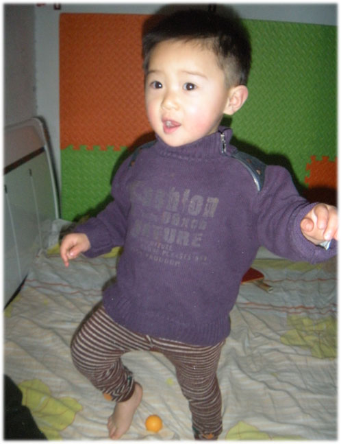 本来我是让他在我们床上蹦蹦跳和拍皮球呢,当外屋电脑里的音乐一响起,他立刻扔掉手里的球,先是仔细的听了两耳朵,然后突然一个转身背对我们,双手悬在腰间,不停的扭动着他的小屁股!特可爱,不过我好像没拍照,因为太突然了,来不及抓拍~~后来只要我给他放这些音乐,他不管是在床上还是地上,都会停下手里的一切事情,专心的去蹦、去跳、去扭屁股~~ 有一次我闲的无聊,非要抱着他满地转圈,结果一不小心把他给转上瘾了!天天缠着我说“妈妈抱!妈妈抱赵宏睿转圈圈!”,唉,我这算是搬起石头来砸到了自己的脚么?呵呵~~这招儿只有我会,家里其他人不是不会,是不太敢,没转两圈他们先晕菜了!而我不会,我从小就喜欢转圈玩,秃秃也随我,转多少圈都不晕,即使真的晕了,轻易也不会摔倒。别看他才两岁,可平衡能力相当不错,他知道就着那劲儿走,往哪边晕、就冲着哪边走,一会儿就不晕了。 这些曲子里,秃秃最喜欢的是一首恰恰(我对这些完全不懂,只知道里面有句“恰恰恰”,就管它叫恰恰恰)。给他放歌的时候,如果我让他自己选择听哪首,他一定会说“赵宏睿听恰恰恰那个”~~哄他睡觉的时候,怕放音乐会吵到他,我特意去外屋把声音关了。结果小家伙坐起来揉揉眼睛问我“妈妈,怎么把音乐关了?”,我说“我怕吵着你啊”,可他却说“我还听音乐!”…… 尽管家里亲戚有想培养他学跳舞的想法,可我到没想着必须要他将来怎样,这些都是丰富自己业余生活的方法,不一定靠它去谋生。所以最终还是要看小家伙自己的意愿,如果长大了,他喜欢,那就学,如果他对这些没什么兴趣,那我们也不会去勉强他,只希望他一直那么快乐就好了……
