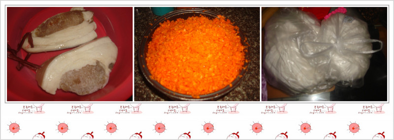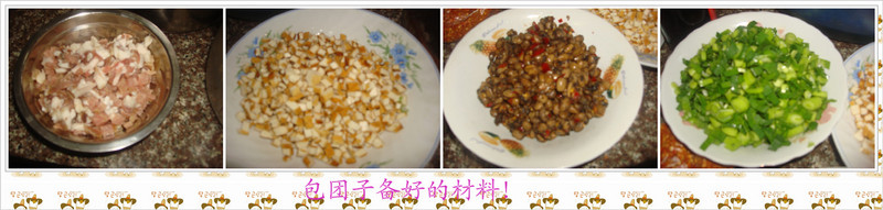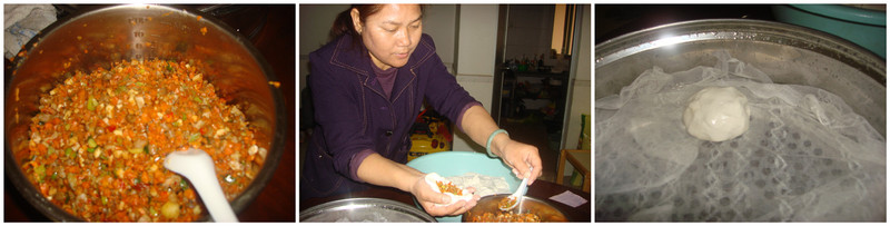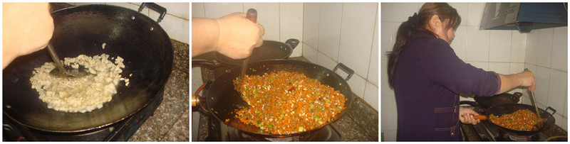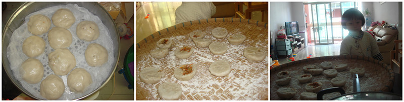 面揉和得差不多外婆要去把切成沫沫的菜一起炒熟, 有胡萝卜、大蒜梗、豆豉、腊肉、豆腐、辣椒, 全部一起在锅内炒熟之后盛在盆内, 然后她外婆就开始包老家的“团子”, 先捏一小团面团捏平然后把菜放在里面包好, 我也帮忙包了一下可是那手艺弄不好, 妈妈叫我不要包她自己来包了。我想帮忙的心只能作罢!