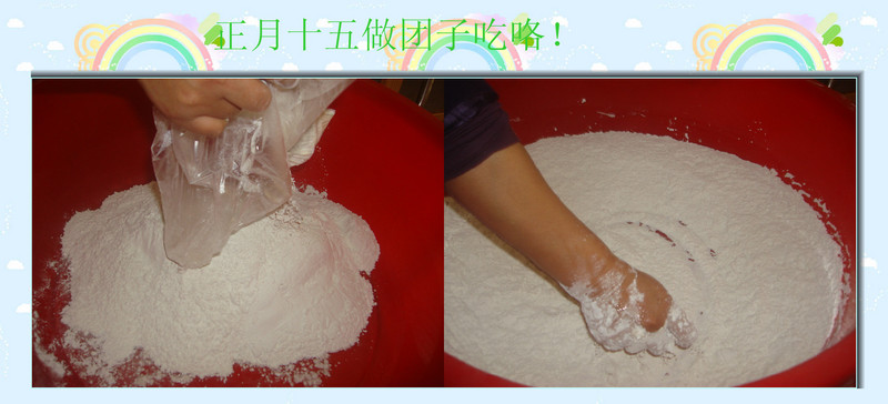 正月十五到了我们要开始包自己家乡的风味“团子”, 不知道这边有没有这做法或是叫法, 以前小时候就是吃奶奶包的, 很大一个做完就让我们吃,可我们根本吃不了那么多。 我们从超市回来就开始要和面团了, 小妍也要来凑热闹说我也要揉面团, 没办法只好另外给她一个盆,让她自己去揉来揉去的。