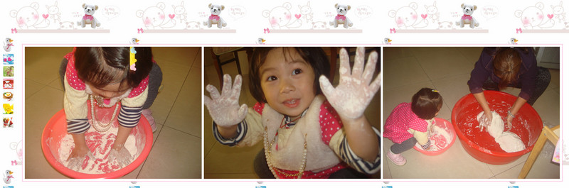 她外婆一边揉我一边帮着加水, 总之这个我是不会做,只能打下手了, 外婆叫她爸爸做点事情,小妍也帮着外婆一起喊她爸爸做事, 因为她爸爸在看电视衣服洗了也不去晒, 因为叫了好多次都没有动, 女儿急了说:“爸爸,你只知道看电视,过来帮忙揉面团”。 女儿知道叫人来帮忙了,确认是她爸爸看起电视来魂都不记得了。 她和外婆一起揉面团说:“外婆你看宝宝在做什么? 一定要回答不然总在那里问,外婆说宝宝在揉面团真棒啊!” 然后小妍又说:“我看外婆是怎么揉面团的,我们外婆在揉面团比赛!” 真有意思这些话语都是脱口而出的。