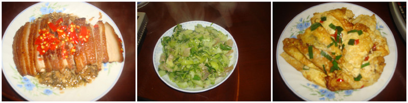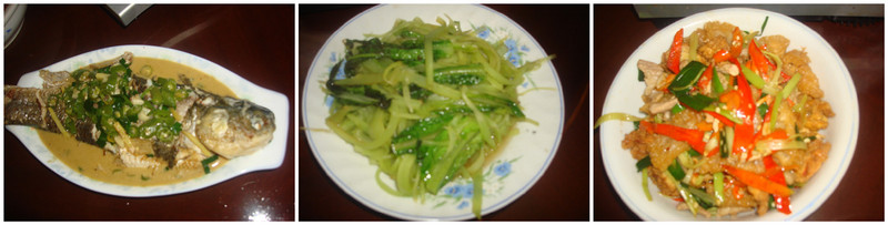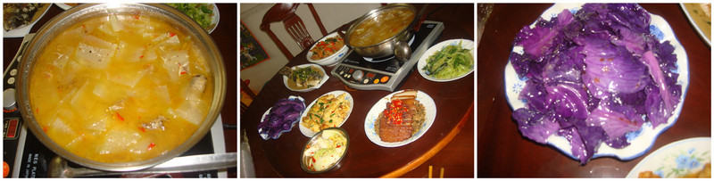 因为一个灶在蒸团子,只能用另一个灶炒菜, 正月团圆节吃的菜有:野鸭火锅、青炒莴笋丝、青炒紫甘兰、 青炒春菜、蛋卷、红烧草鱼、辣椒炒肉(大碗菜)、泡菜、 咸菜蒸扣肉,这不也挺多菜的,有菜也有肉营养要均衡。