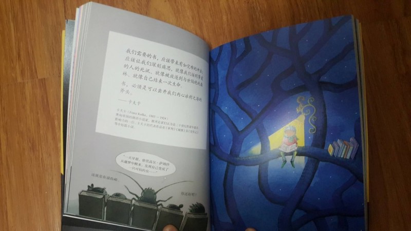 这本书内容之所以让人过目不忘,因为内书中聚集了很多我们时下热门的话题,这个话题不是别的,就是家长们最为重视的读书问题。说到阅读,很多家长都意识到了,从小就为孩子选择各种图书,希望从小给孩子养成一个读书的好习惯。可是看看现在的读书问题,我也发现了一个现象。现在去书店的人感觉越来越少了,难不成是人们不喜欢读书了么,实际不是,现在只是大家选择购书的途径不同了而已。 翻开这本书,就会感受到几米的画风特点,明艳靓丽、温暖倍增。翻开书,穿着水手衫的小男孩便酷酷地出场了,随后,几个孩子聊着网络买书更便宜、网红直播更好看,线上游戏可以多人玩,养青蛙的女孩觉得蛙儿好可爱……登场了。我们真的看到了社会现象,今天的孩子们,完全不需要通过书去感受生活,虚拟的世界给他们的乐趣足够多了。 为了不让书店倒闭,小男孩帮爸爸请来同学们开了一场“热爱读书分享会”。爸爸想用投影仪放出一些名人热爱阅读的名言,激发大家对阅读的兴趣。孰不知,名人名言很好,但孩子们心里盘算的小九九更妙。孩子们真是落出凡间的精灵,那些反驳的话,让我们这些大人都忍不住默默点头。 可当说到“书是最完美的快乐时”,孩子们彻底怒了。一个说,“有的书又大又重。有的书设计不良”。另一个说,“有的书胡说八道。有的书错误百出”。嘿,大人们,你们听到了吗?甚至有一个孩子吐槽说,“爸妈都叫我不要去看不考试的书。”大人的那点功利心,一下就被小孩戳破了。小孩口无遮拦地说出了与大人最深的矛盾:“为什么大人自己不读书,却要小孩有功读书?”“大人都是为了小孩好,但自己却不想变好。”这点相信很多人都会从书中得到感悟。
