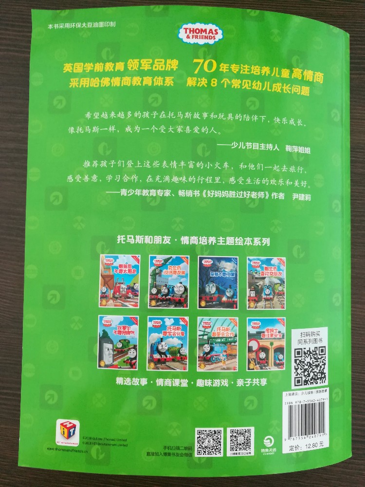 哈哈,刚刚看了一下,这套《托马斯和朋友 情商培养主题绘本系列》,一套是8本,我随机收到的是其中的一本——《托马斯要学会分享》,不用说,孩子们肯定是会让我把剩下的都买回来,哈哈,而且现在是越来越贴心了,我看到这本托马斯的绘本后面,是有二维码的,只要扫一下,就可以购买同系列的图书,也省的我们继续寻找了,非常的感谢呢。