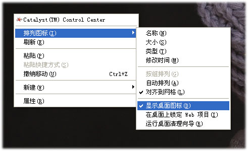 我郁闷,虽然以前遇到过种情况,也解决过,可那也已经是好几年前的事了,现在早就忘了这样的情况要怎么处理了!这东西上哪找去呢?我开始胡乱猜测胡乱尝试……先鼠标右击桌面,点属性,看主题、桌面、外观、设置,可哪个里都没找到有关桌面图标的事~~找不出桌面图标的我,又开始抱怨“以后别让他乱动我电脑了,都给我弄没了,赵宏睿!以后你要再给我把电脑弄坏了,我就不让你看节目了!”,听着我怨声连连,姥姥不高兴的甩了我一句“你们俩都是学计算机的,怎么我们小家伙会弄的东西,你俩都不会弄呀?还好意思赖我们”,我当时就被说无语了,想想看,也是挺丢人的…… 于是又赶紧上网找高手求救,这熟能生巧的小技巧,高手也和我一样,要现找现研究。不过高手就是高手,研究的比我快,想到的方面也比我多,在发现右击桌面和快捷工具栏均无果后,突然想到了个最最简单的方法——右击桌面!这个菜单平时经常会用到,可却从来没注意到一个小细节:排列图标……在鼠标右击桌面的排列图标里,靠下的位置有个“显示桌面图标”选项,不会吧,原来就这么简单啊??听高手的话,我点了一下这个选项,果然,桌面图标又乖乖跑回来了……唉!难怪连秃秃这个两岁的小屁孩都会操作,原来这么简单!看来我真是脑子不够用了,连如何简单的操作都没找到!惭愧啊~~ 这是在笔记本上的截图