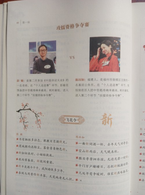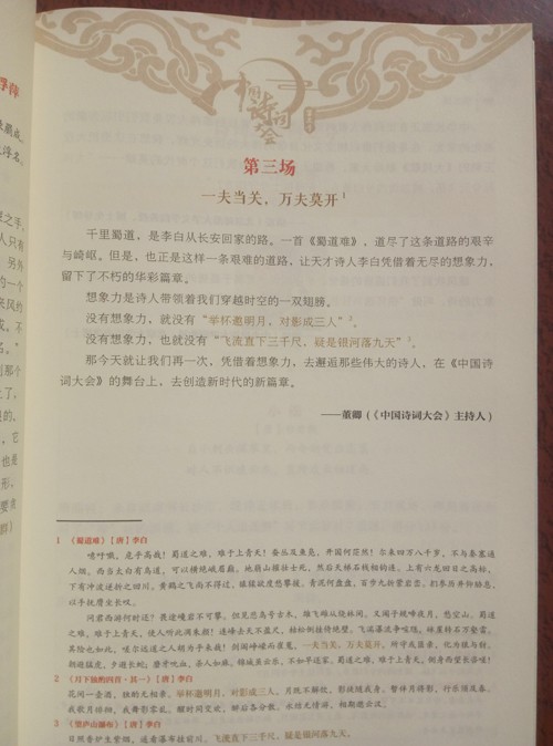 第三季共两册,我收到的是其中的上册。本书以各选手比拼的场次为顺序,依次从个人追逐赛、攻擂资格争夺赛、擂主争霸赛、自我评价四个方面展现了各选手的诗词考题,同时也可以让我们检测我们对于诗词的熟悉程度,然后一一讲解整诗的内容、出处和解析,再由权威嘉宾作一番精美的点评。入选的诗词纵贯古今,内容丰富,从古老的《诗经》直至当代的毛泽东诗词,楚辞、汉魏六朝诗、唐宋名篇、明清佳句尽入选其中。通过选手们的逐一比拼,带领着我们重温了这些佳篇名句的持久魅力,感受了诗词中诗人们流溢出的情感,感受了中华文明的源远流长和博大精深,完成了一次跨越千年、纵贯古今的文化精神之旅,极大地激发了作为中华民族一员的自豪感和自信心。
