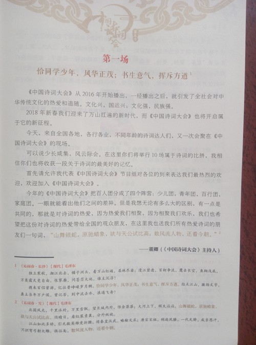对于我个人来说,最关注,最喜欢的是本书中的嘉宾点评,这也是其中最精彩,最精髓的部分。记得当时看电视直播时也是最期待嘉宾们的点评。嘉宾们学富五车,信手拈来的深入浅出的点评讲解,字字珠玑,有一种能让我们醍醐灌顶、豁然开朗的振奋感。在点评中,让我们能够从中了解到诗词作者当时写诗词时的背景、当时作者的心路历程等等,从而能让我们对诗词有一个更为深入的了解,更能理解到诗词的独特魅力。