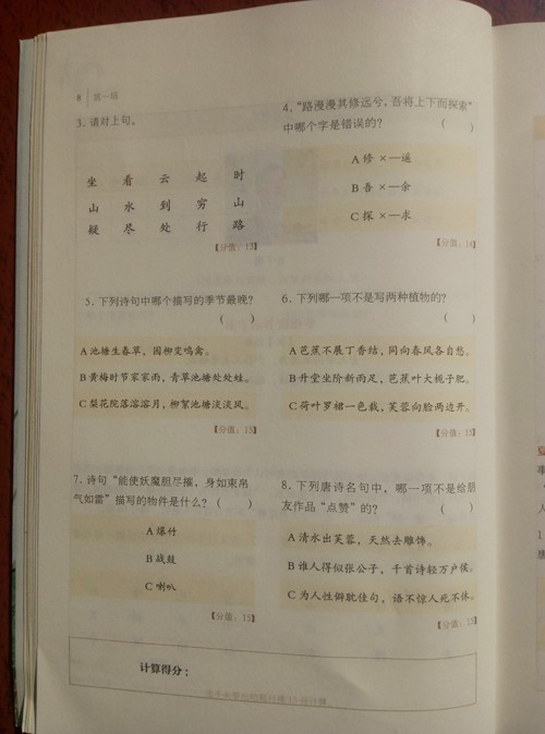 我们还在继续研读这本书,对于小家伙来说,他最喜欢的就是去答一答选手们的考题。小家伙受我的影响,也是很喜欢诗词,并且有两年多念诗词的经历,许多考题都能答得上来。每答对一题,自是非常欣喜。