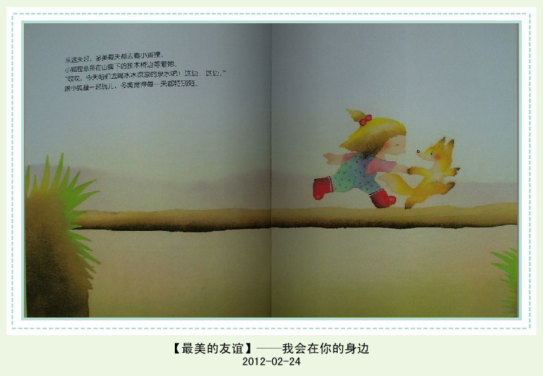 从那天起 多美再也不能一个人去外面玩了 除了上幼儿园 妈妈都会和多美在一起 可是晚上做梦的时候 多美总会梦到小狐狸在小桥边等着她 渐渐的。。冬天来了 有一天 多美来到了小桥边 小狐狸果然在这里等着多美 可是小狐狸伤心地说 “你还是把我们的秘密说出去了。” 小狐狸睁着圆圆的眼睛看着多美 “其实我早就知道,人们很讨厌我们,认为我们会迷惑人,所以才让你保守秘密的,可是现在已经晚了” 小狐狸可怜的样子真让人心疼啊 下雪了 多美感觉好冷啊 小狐狸对多美说 让我做你的围脖吧 多美笑着说小狐狸你可真够重的啊 两个小伙伴慢慢的恢复了往日的快乐