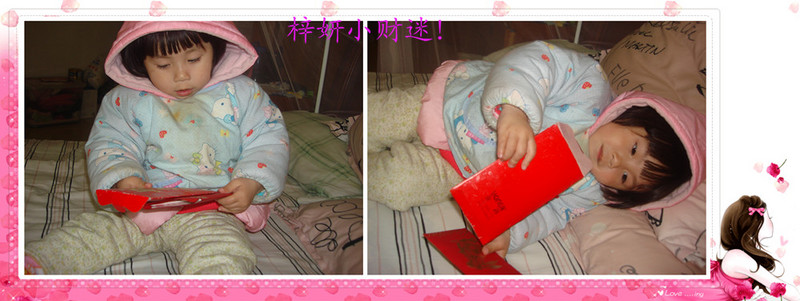 ![]() ![]() ![]() ![]() ![]() ![]() ![]() ![]() ![]() ![]() ![]() ![]() 我们过年在东莞,那小孩收压岁钱那真是多多的,家里人亲戚都比较喜欢我家妞,那压岁钱还真不会少,她舅舅最喜欢梓妍了,不过没赚什么钱我也不希望给那么多给宝宝,舅舅每年都会给宝宝压岁钱的,宝宝才二岁多就过了二个年,真是幸福,虚岁就是三岁。 回老家那还真收了不少红包,我们包出去的不是很多,同辈的就不用包红包,还真是免去了太多的红包,回到家一数我家妞的压岁红包居然高达七八千,真是太感谢了,谢谢她们宝宝也挺喜欢红包的。今年的压岁钱决定帮她存五千,给她自己开个存折,去年的已经被我们用掉,所以今年的不能再用掉了,帮她存起来。 我把她的压岁钱放在二个大红包里面,外公就给了二千给宝宝,好象舅舅的比宝宝的还大,哈哈!那天我把红包全部打开了,我说妈妈帮你装起来,她那个倔劲,坚持是不让我帮忙,说自己帮忙,结果一拿全问拿出来了,那可就是钱啊,小妍说“钱了,还有钱,还有了”,如果是哪个给她红包,她说还有,我看看里面还有没有,不过钱钱都是给妈妈收起来了,现在谁给的红包我都把名字给记起来了。 梓妍说“妈妈,这是我的钱,我说这是我的”,那个急死人的劲就上来了,哈哈!为什么她们就知道这个钱钱就是她们的了,有些人给她红包,我说不要,她自己也会说不要,然后还会说谢谢,我不要,不能要。 后面在床上数压岁钱的时候说“我闻一闻,这钱钱是什么味道”,我说是臭的味道,她说不臭,挺香的,我说真是守财奴,看着落在一床的百元大钞,我说“妈妈要开始抢钱钱了,抢到了就是谁的,她说‘妈妈不要抢,这是宝宝的’”,连妈妈都不能抢,还她在回味臭钱的味道,不过我赶紧把臭臭的钱钱收起来,钱虽臭,但是我们都得需要它,我们都是在为它而舍弃孩子去赚钱。 女儿今年收到的压岁包! 准备拿钱钱出来数一数了! 还跟我说钱是香的,明明是那么臭的钱! 自己拆红包,拿出来几张,说看还有没有,不过拿出来的钱都交给妈妈了! 总之现在这个钱钱是不交给妈妈管,但是我一样给她看不到!