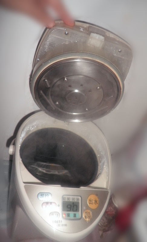 这是在网上看到的图片 这是我自己拍的实物图,在保温那里有个小灯亮着的,就是通着电的。这个操作很简单的,可以自己设置温度,有60 80 90 98 4个温度可设置,看你是需要什么温度自己设定好就可以,我一般是设定的90度,随时都有热水,主要是好方便给罐罐兑奶,左边有个预约健,也就是说你可以自己设置好烧开水的时间,右边有两个键,要先按一个解除键,再按出水键,就有热水出来的。 如果说用久了有水垢,说明书上是说用柠檬酸清洗,但我个人认为,最开始可以买专门的除水垢的,一次一小包,但用久了就很多了,除垢粉就不好用了,那就用白醋就可以了,很方便的,就晚上要睡觉时,先把水瓶里面的水烧开,然后拔到电源插头,就倒一瓶白醋在里面泡着,早上起来直接倒了,然后多清洗几次就可以 这是打开看里面,里面还有热水,所以一开就有热气上来,这个里面的内胆是备长碳涂层,至于那个什么备长碳涂层是专业术语了,我只知道是现在好的电饭锅什么都是用的这种材料 这就是我家的电热水瓶 本作品未经作者许可不得转载,转载请征求作者意见。擅自转载使用,将保留追究其法律责任的权利!