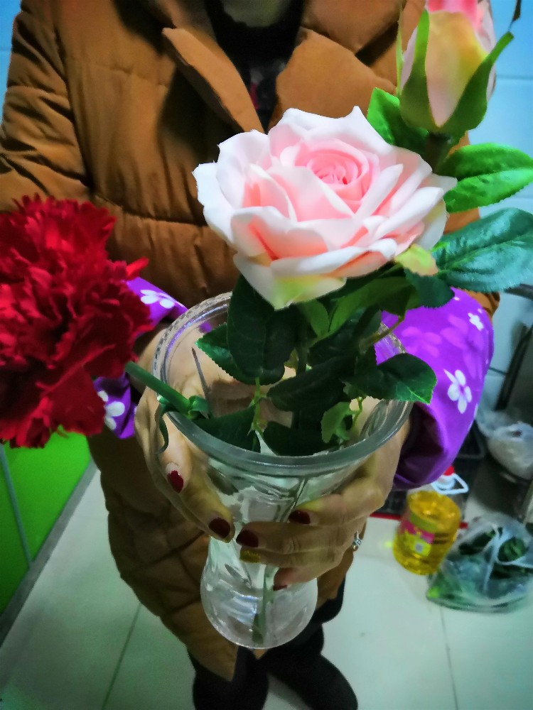 然后的话,儿子也是要买一支,哈哈,那就买吧,儿子不喜欢康乃馨,他觉得玫瑰花好看,我想让他买红色,他不要,说要买粉色的,我拿到手上,才发现儿子选的粉色玫瑰花是假话,真的是没有看出来,儿子说这个好,都不要喝水,这个确实是挺好的,也是10元一支。