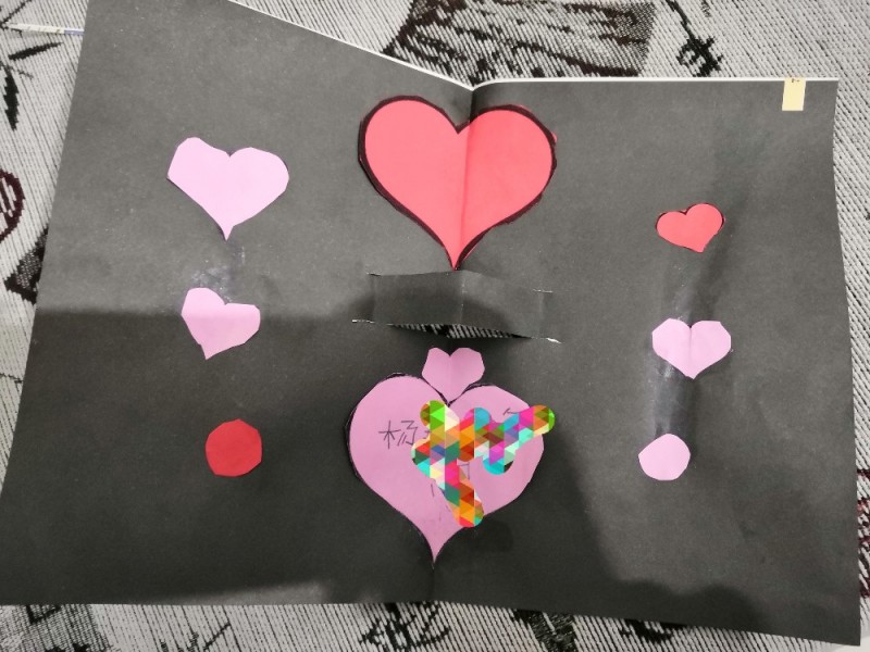 这个用的黑色的硬纸做的手工,里面用了红色、粉色卡纸剪成的爱心形状的图片,虽然比较的简单,但是也是孩子自己用心做的,所以我还是挺满意的,上面还有儿子自己写的名字,挺好的呀。