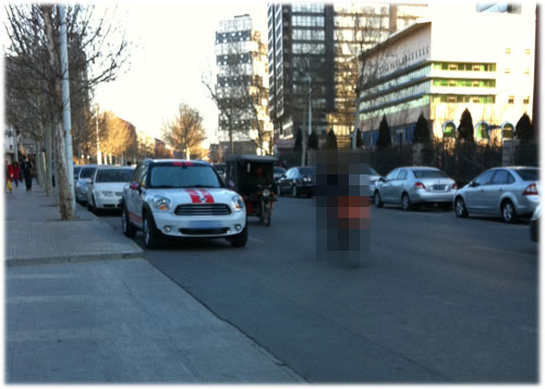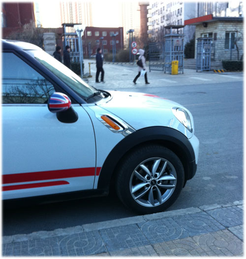 不过喜欢归喜欢,到是从来没想过真的买一辆,我又不爱开车,买它干嘛,整个就一浪费钱~~但在路上看到别人开的mini还是挺喜欢多看几眼的。最近经常在我们单位那边看到一辆很大型的mini,比平时看到的minicooper都大很多,看了看车标,是mini啊,不是国产的,可是怎么这么大呢?回来跟老公和朋友说起此事,他们非告诉我是国产大山寨! 为了证明我看到的不是山寨,那天上班路上再次经过时,我特意拿手机偷拍了几张,回来给他们一看,终于承认这是mini新出的一款车了~~这车很大型,至少和其它minicooper比起来,它算是很大型了吧。瞧这装饰做的,跟个大足球似的,看着还挺好玩,不过我就算中了大奖想买车,也不会考虑买这款的!mini嘛,就要小巧才好,做的这么大,都没有它原来的特点了……