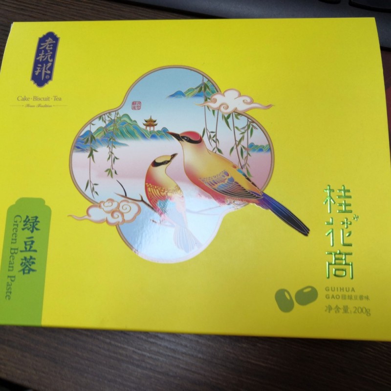 盒子上面有绿豆蓉的字样,然后就这么看到了桂花糕,本来以为是绿豆糕的,一盒是200克的分量,单独包装的,一盒8个,包装这么好,价格应该不便宜吧,而且是在景区买的。包装很可爱,里面的桂花糕也是可以看到图案的,跟外盒的包装上面的图案是一样的,这边吃桂花糕,边欣赏上面的美图,感觉不要太好。