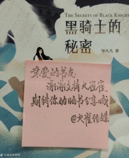 我收到的书是:《黑骑士的秘密》。书的封面上还贴了一个粉色的小纸条:上面写着: