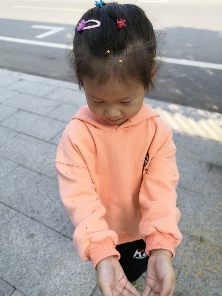 小丫头站在树下,我抖动树枝,这桂花就这么落下来了,小丫头站在树下,看着真的是感觉挺美好的。孩子好奇,为什么桂花颜色不同啊,有黄色、有橙色?告诉她是品种的不同。桂花落在孩子的身上、头上,我还特意拍了几张照片,岁月静好,只因有你。
