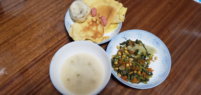 老妈为了让我们早晨不紧张好好吃顿饭,每天不到五点半就起来做饭了。昨天晚上蒸的豆包,今天早晨又摊的鸡蛋饼。两种主食大家自由选择。豆包不是很大,昨天晚上孩子下课回来饿了,一口气就吃了三个。豆馅是自己做的,不是很甜我觉得甜度正合适。鸡蛋饼有放胡萝卜和不放的。姥姥这个早餐做的挺花心思的了。主食还有红薯,最近每天早晨基本都吃红薯。我是挺喜欢吃的,每次如果太多吃不完,就切成条凉成红薯干,每次半干半湿的时候最好吃。又甜又有嚼头。 熬的是豆粥,我没有喝,我自己喝的牛奶。其实豆粥也是非常有营养的。菜炒的是雪里红,不知道大家知道这个菜吗?北方可能吃的多一点吧。一般都是先提前把菜腌一下,大概也是冬天便于保存吧。然后配肉或者黄豆一炒特别好吃。我们家这个是楼下阿姨给的,咸度正好。然后我妈配上黄豆和胡萝卜一炒味道很棒。颜色搭配的也很漂亮。绿色、红色、黄色搭配在一起看着很有食欲啊。 鸡蛋应该也算主食吧,我们吃的是从单位买的土元乌鸡蛋。是我们单位自己养殖的,感觉还是比较靠谱的。就是鸡蛋个头特别小。大人一口就能吃完了。这就是今天的营养早餐。因为不是一个点吃饭,所以谁吃就盛一点出来。