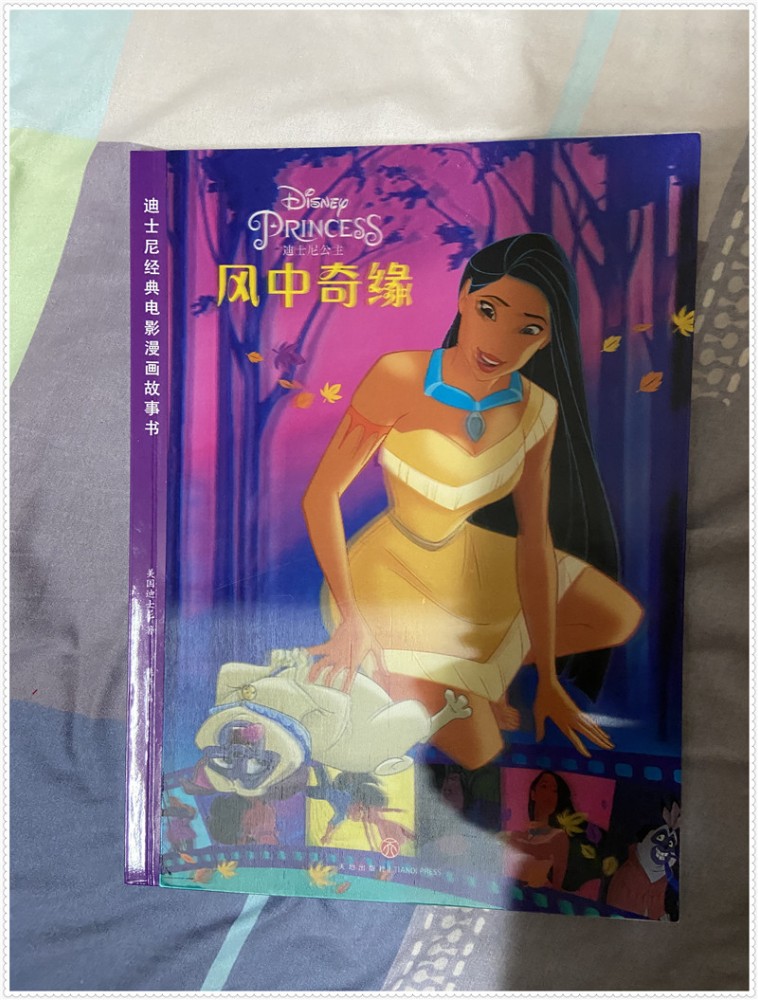 我收到的是其中一册《风中奇缘》。光看这个封面独特的设计就让人眼前一亮了,不知道这是采用什么材质来制作的,很厚实的封面,而且整幅都是闪亮的胶质地,让整体看起来很有立体感,这种材料当封面,还是比较少的。这个迪士尼人物是本故事的女主角印第安公主宝嘉康蒂,她长着玫瑰花瓣似的嘴唇,乌黑长发随风飘荡,很有东方美女之感哦。
