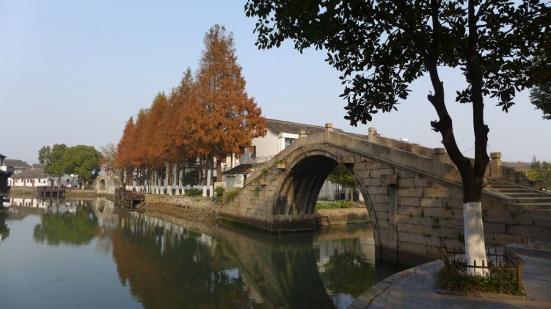 进镇沿金溪路往里走,镇门口也没有收门票的迹象,过了一座金溪桥往右转,就看到水乡的模样了,平缓的河流,安静的石拱桥,沿河的枕水人家,青砖黛瓦,错落有致,就像电视里放的一模一样。沿河的小路都是石板路,干净异常,路上人非常少,感觉心一下子可以静下来的。这里,即使在周六的早晨,也是游客稀疏,完全还没有商业化。 据说金泽是有名的桥乡,有“江南第一桥乡”美称,小镇里有着跨越了宋、元、明、清四个朝代所建造的七座古桥,每座桥都是一段历史,她们静静地横卧在清澈的水面上,讲述着自己的故事。小镇淳朴自然,干净安静,我们沿着古镇里小河边走过一座座风格各异的小桥,十分的舒服惬意,全身心的放松。