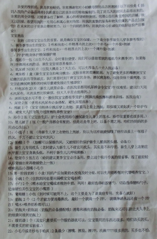 打开包装,首先看到掌柜蛤妈写给每位准妈妈的入院待产必备品清单,洋洋洒洒二大篇,看来是费了不少心思的。我的宝宝已经三个多月了,虽然对他来说可能用不了太久了,但是我会给我妹妹家的宝宝留着的,因为这款帽子非常适合新生宝宝。清单上所列举的东西实在是太全了,想必蛤妈是个很细心的人,并且在发货之前,还会和我们获得试用机会的妈妈们确定帽子的颜色,真的非常感谢!