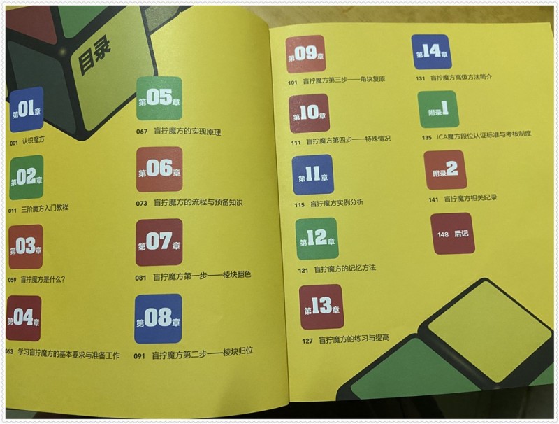 本书的质量很好,图文并茂,全彩色的印刷,让学习过程不会觉得眼睛疲惫,而且书中多处有二维码,可以直接拿手机扫一扫,有专业老师对此处知识点的视频讲解,非常详细,真的设计非常周到贴心。全书一共分为十四章节,从认识魔方、三阶魔方入门教程,到介绍什么是盲柠魔方、基本要求与准备工作、流程与预备知识,接着分四步来讲述盲拧魔方的相关知识,以及记忆方法,最后介绍了盲拧的高级方法,深入浅出地为我们呈现了生动的魔方教程。