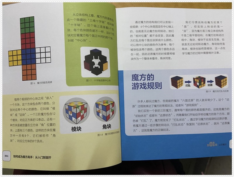 家里有几个魔方,都是益智玩具型的购入,孩子并不会玩,通常就是转拧一通,看到同学扭得出神入化的,羡慕极了,一直想让我找些学习魔方的资料。后来才知道原来要想快速地还原魔方,是有科学的公式来计算的,并不是麻目地乱拧,只有好好的掌握了这些技巧,才可以玩得尽兴。一本带你遨游魔方世界,从入门导盲拧的书本来了!