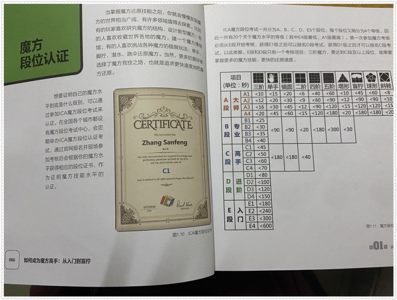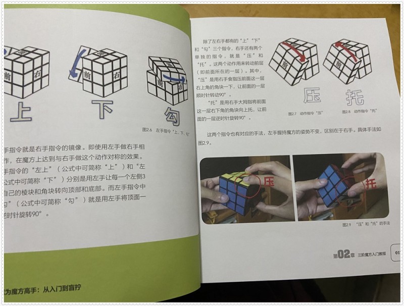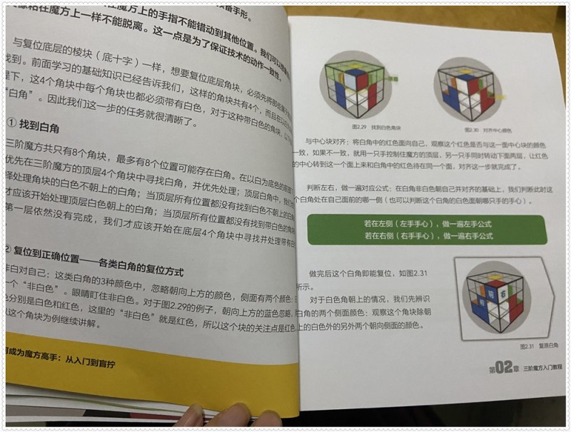 接着三阶魔方的入门教程来了,三阶魔方是由六个面组成的立体正方形,每个面都可以自由转动,而每个魔方的转动是以层作炎单位实现的,不同的转动指令,右手指令的向上、向下、左勾、右勾,都有相应的手法指引,那里找到白角,以及复位到正确位置,把各类白角的复位方式,一步步来引领着,三阶魔方还原还有七个步骤,有各种的公式。书本的最后还向我们介绍了魔方段位的认证以及考核制度。我们可以在图文中学习到不同的指令,自己可以一边看着,一边尝试拧着,感觉清晰了很多。