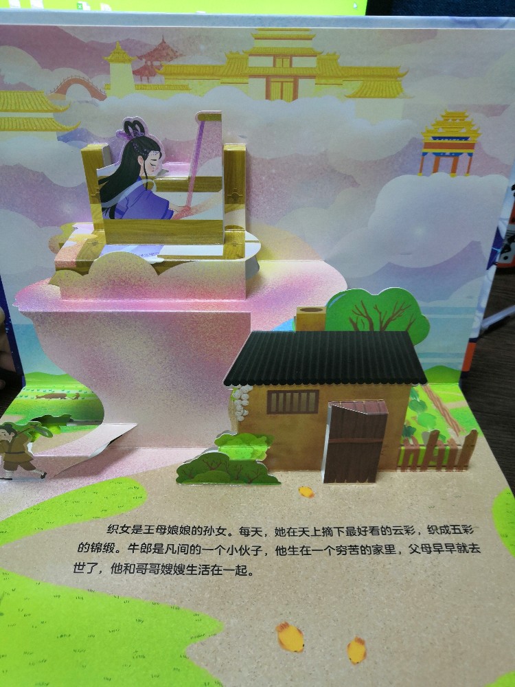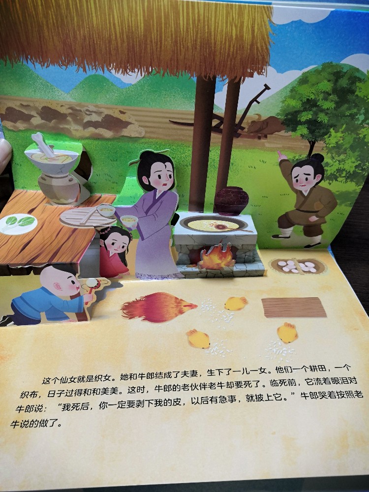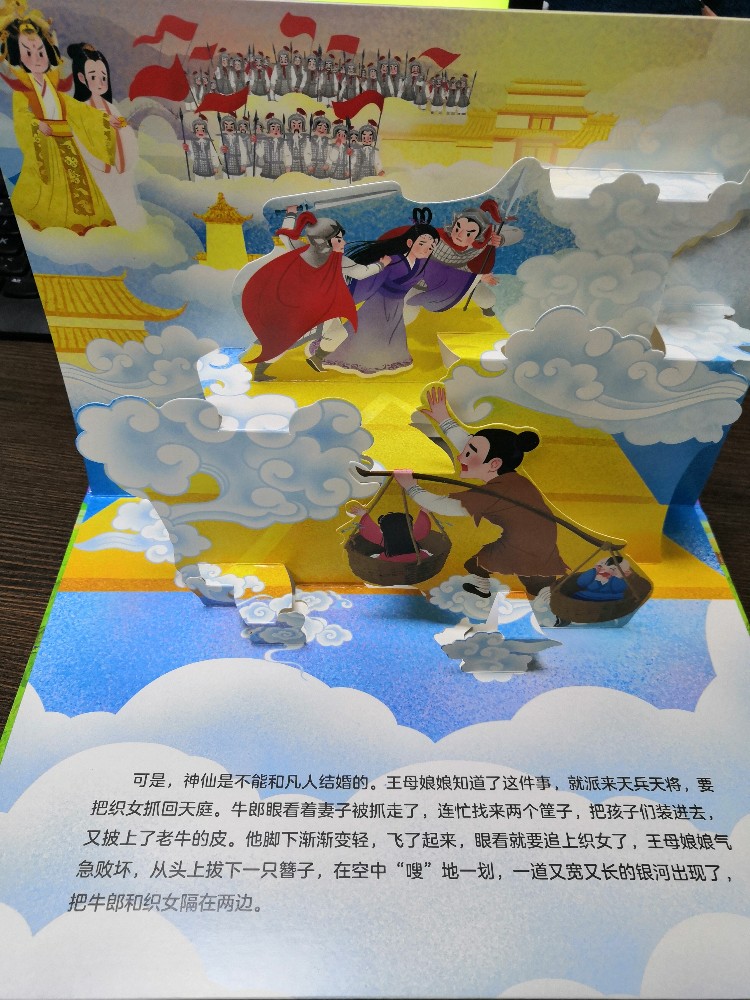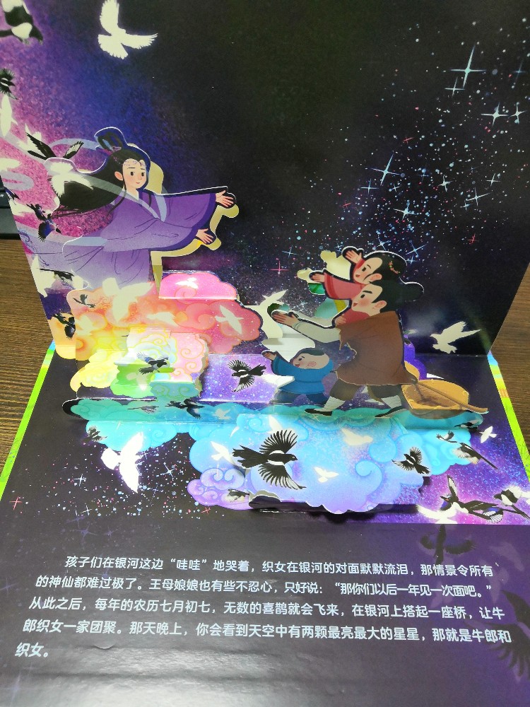 这四册,我随机收到是——《牛郎织女》,文字内容其实并不多,我倒是觉得这样很适合孩子看,一个呢,我是注意到了立体图上面的人物表情,哪怕就是动画形式的表现,人物刻画的也是栩栩如生的,表情变化能够从画上窥探一二,高兴还是沮丧,这样很直接的表现,让孩子看,也是会很容易一下就理解的,可见作者在这方便是下足了心思的。另一个呢,就是随着场景变化,周围颜色的变化,我最喜欢最后,牛郎织女和孩子们在银河想见,周围繁星点点,看着就是给人一种非常美好的感觉。自从有了孩子后,感觉自己是越来越感性了呀。