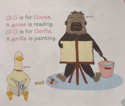 这是一本很适合孩子们阅读的英文儿歌书。书本的版式设计很符合孩子们的喜好,色彩明艳鲜亮,图案活泼可爱,具有让孩子们一见钟情的特质。我特别喜欢这本书的封面,明亮的阳光下,绿色的草坪上孩子们在欢唱,天上白云朵朵飘过,一道彩虹在孩子们头上跨过,整个图案动静相宜,灵气逼人,让人过目不忘。书的内页也有同样的特质,底色、图案、文字,都经过了精心设计,搭配合理,相得益彰,让人感觉非常地舒服,让孩子们有身临其境的感觉。 这是一本很适合孩子们阅读的英文儿歌书。书本的内容设计很符合孩子们的特点,分主题设计,逻辑非常清晰。全书9大生活常见主题:字母乐园、动物世界、色彩天地、形状大小、数字广场、人体感官、温暖之家、职业场所、季节天气,涵盖了日常生活的方方面面,让孩子们在熟悉的生活场景中学习英文,让人有一见如故的感觉。 下面我们跟着书本来学习,随便挑一首儿歌来学习一下吧。这首儿歌是学习字母G的,儿歌的内容很有意思:G! G is for Goose. A goose is reading. G! G is for Gorilla. A gorilla is painting. 简简单单的几行内容,易学易懂易记,我读一遍就记住了。儿歌内容虽说简单易记,但若是枯燥的字句,对初学的孩子们来说也是有一定难度的,但书本给儿歌配上了有趣的图案,把儿歌涵盖的内容通过生动活泼的画面展示出来,用孩子们熟悉的生活场景来诠释儿歌,让这首儿歌对孩子们来说也变得易学易懂易记了。100首儿歌,每一首儿歌都保持着同样的风格,字句简单,朗朗上口,内容紧贴生活,内容展示活泼生动,易学易懂易记。