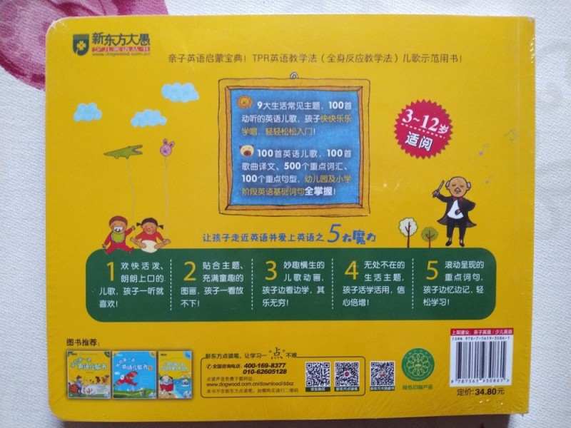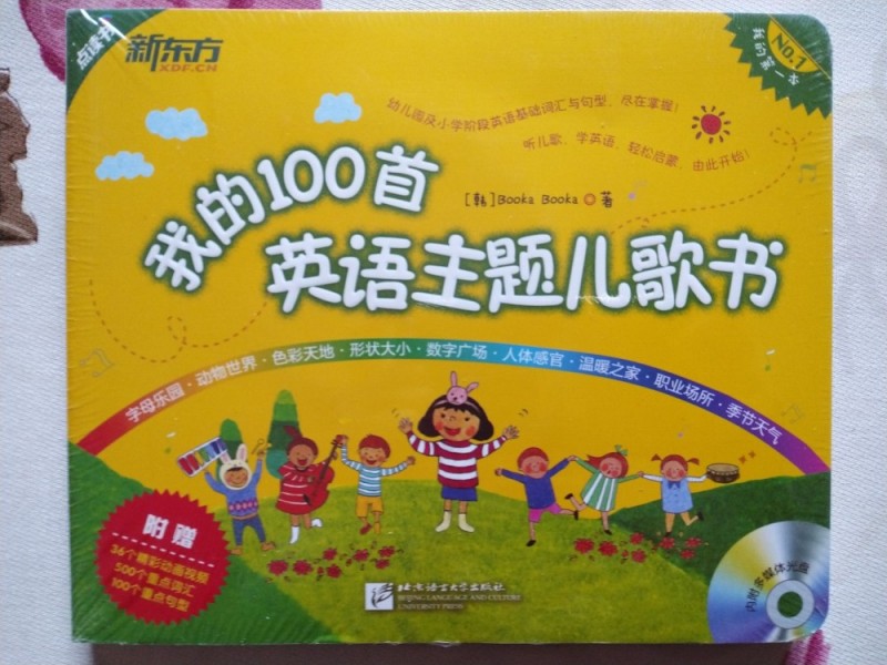 书 名 :《我的100首英语主题儿歌书(点读版•附多媒体光盘)》 品 牌 名 :新东方童书 儿歌朗朗上口,易学易懂,我们基本上都是听着唱着儿歌长大的,儿歌是学习一门语言的最好工具。在中国,中文儿歌书籍很多,英文儿歌书籍相对来说要少一些,好的英文儿歌就更少了。这本《我的100首英语主题儿歌书(点读版•附多媒体光盘)》让我眼前一亮。