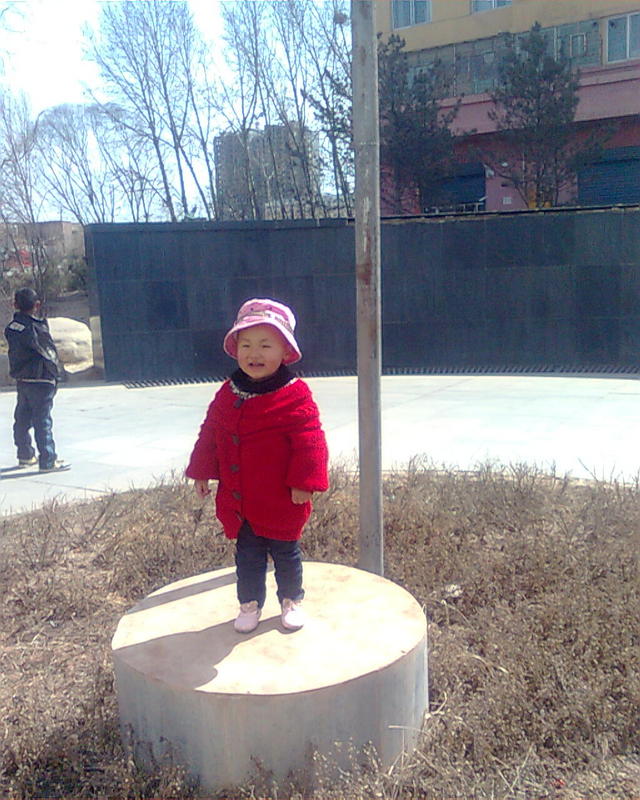 一个小台子都可以玩得这么高兴啊 ,就是四周只一些干枯的树。还没发芽呢