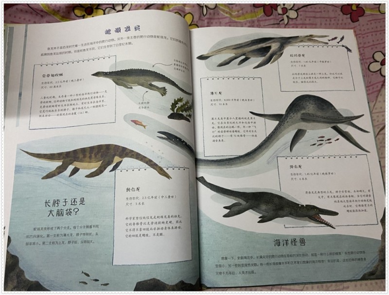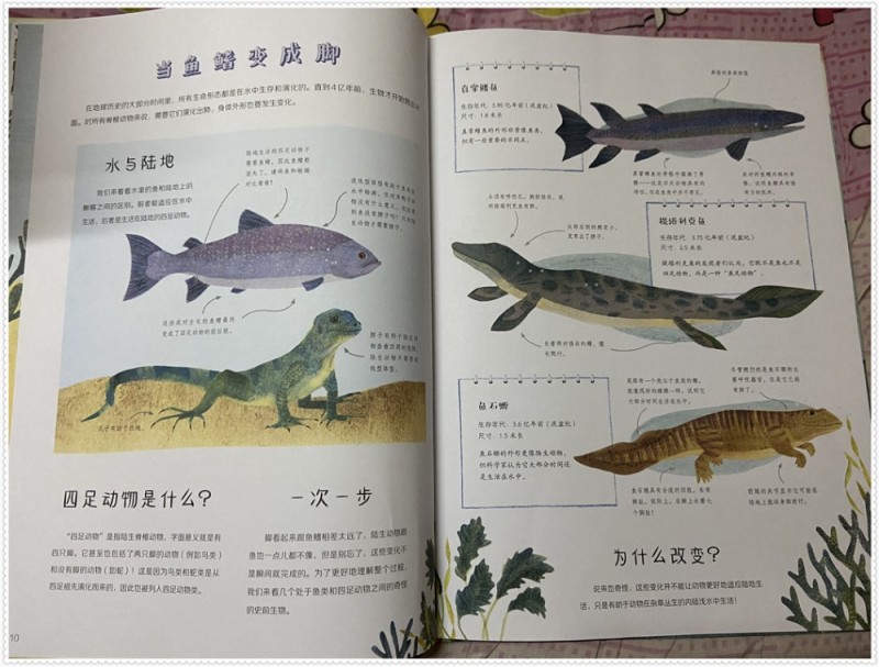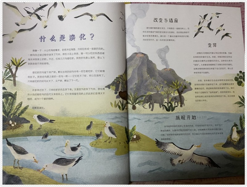 这是一本大开本精装科普书,印刷精美,摸上手纸质很厚实。首先我们一起来看看封面信息,海洋是生命之源,所以整个封面以蓝色为底色,由深到浅向上延伸,,呈现不同海洋鱼类在深海中的状态。我们都知道地球上最早的生物就是出现在水里的,这样从简单到复杂,慢慢演变到陆地上的动物,整体看起来很生动,很有科学思维。打开书本看到目录,清晰地为我们展示了书本的主要内容,全书一共分为十七小节,从开始解释了什么是演化过程到地球生命时间线,接着绘制演化树,一层层深入浅出地为我们解码生命的历史。