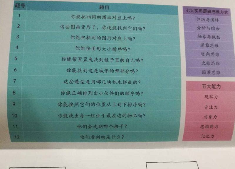 这套书的每一本应该都是十二道测试题,至少我收到的这两本都是,每本书都有和书名对应的主题,每本书里面的测试题都围绕主题而设计,以《形、色与空间》这本为例,书中的测试题就涵盖了积木里面的形状,不停的形状对应关系,让孩子们从变形的图形中找颜色对应,从镜子里的对应动作找相应的歪歪兔形象,把城堡和积木造型拆散,让小朋友找出是哪个部分或者那些积木组成的,把一张图片里面出现的事物按照空间顺序进行排列,图形大小排序,桌子上的物品从不同角度可以看到什么样不一样的图案组合,这样的试题很有趣。从这些试题里面,孩子可以获得七大实用逻辑思维方式(归纳与演绎、分析与综合、抽象与概括、递推思维、逆向思维、比较思维、因果思维)和五大能力(观察力、专注力、想象力、思维能力、记忆力)的锻炼,并不断得到提升。