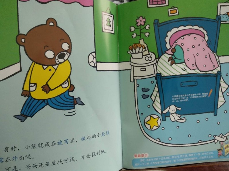 ![]() ![]() ![]() ![]() ![]() ![]() ![]() ![]() ![]() ![]() 我们家小朋友从小就是阅读着中国少年儿童出版社的《婴儿画报》长大的,孩子还专门买了一个红袋鼠的点读笔,只要有MPR的标识,点读笔就都可以点读。收到的这本《幼儿画报科普玩具书》——小熊藏哪儿了?也是可以点读的。 《幼儿画报科普玩具书》这是中国少年儿童出版社出版的适合3-7岁的小朋友阅读的书,书中还有二维码,可以让我们在读故事前扫一扫看一看玩法说明,帮助孩子更好地理解故事内容,这本书的主题是小熊藏哪儿了?小朋友们最爱玩的游戏就是捉迷藏了,无论多大的孩子都喜欢玩,可以说是百玩不厌的游戏,孩子一看这样的主题,仿佛就是他在画面中一样,也想和小熊一起玩捉迷藏。 故事中的小熊是和爸爸在院子里玩捉迷藏,小熊藏,爸爸找,互动性十足,这本书是可以采用孩子问,家长答的形式来游戏的,孩子用“小熊是藏在____吗?”提问,家长只能回答是与不是,孩子猜对后,家长可以给孩子看故事的页面,和孩子一起找到小熊。在寻找的过程中,孩子看到的是四幅画面,每个画面都有相应的关键词,关键词可以填写在横线上,孩子可以自己套用格式,这样的方式,可以培养孩子的语文表达能力,重复的句子,可以加深孩子的记忆,孩子不知不觉中就学会了问句,也在不知不觉中通过画面认识了关键词语,这样的方式还是非常棒的。 这本《幼儿画报科普玩具书》每一个大开页都是一个游戏,都是和小熊和爸爸捉迷藏的画面,不同的是小熊藏的地点不一样,孩子们仿佛就在户外玩耍一样,兴致特别高,当宝宝看到小熊藏到了被窝里露出屁股的时候,还在哈哈大笑,熊爸爸也只好装作看不见,这样的场景和我们生活中是一模一样的,但是孩子还是玩的乐此不彼。 《幼儿画报科普玩具书》这样的书,不仅是书,同时也是玩具,可以让孩子在阅读的同时寻找到快乐,只要把书立起来,场景页给孩子,故事页给家长,不仅能够通过提问提高孩子的语言表达 能力,也能让孩子学会推理,拥有一定的思维判断力,孩子还可以认识更多的汉字,增进了亲子关系,这样的书真棒。 本作品未经作者许可不得转载,转载请征求作者意见。擅自转载使用,将保留追究其法律责任的权利! |