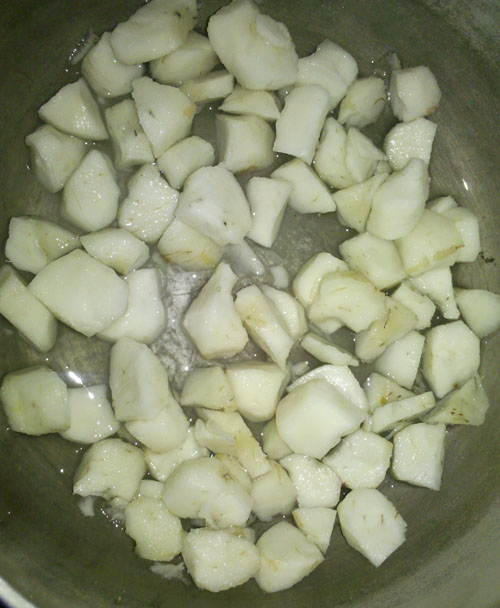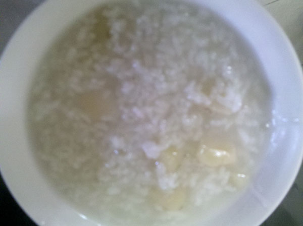 ),去皮再切成块,为什么用块形容呢,因为我觉得老公切得有点大,既然是煮粥,应该切成丁才好,但是因为不是我在做,所以不好乱发言,省得惹他不高兴,何况他还有点感冒呢。你看看,是不是很大块?
