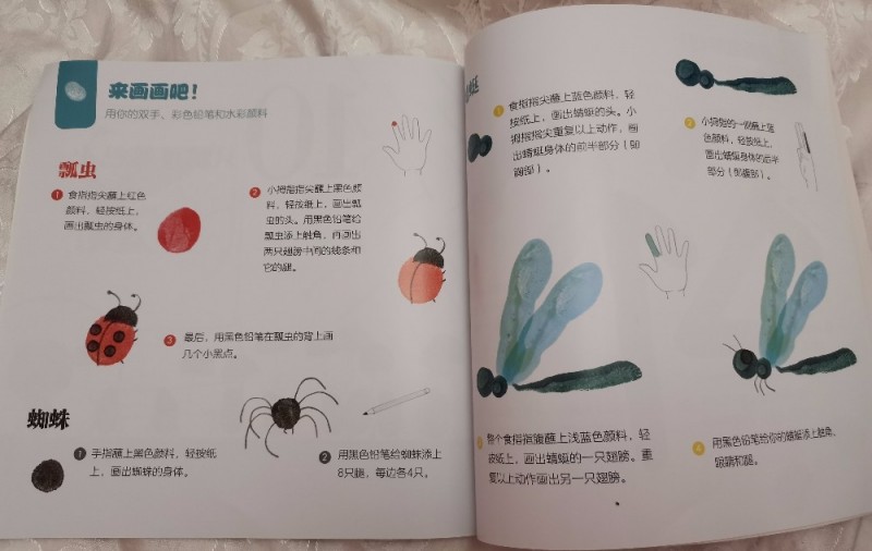 ![]() 什么是艺术?在我看来,就是能把平凡的东西做的更文艺。同样是画画,我们拿画笔随意画个画,那就是一张普通的话。可是,当你手指上蘸上颜料,根据形状创作出可爱的小动物啊,花花草草啊,那就不是普通的画了。而是艺术品了,我们称之为指印画。这样的画,非常适合亲子玩哦。 这么好玩的书,自己乐乐不如众乐乐,一起来乐乐哦~ 这是一套来自法国的创意满满的手指印画书。在这套书里,无论是我们的主角小老鼠莉莉和亨利,还是一只蝴蝶、一只蚂蚁……都是通过手指印画画出来的。在这套书里,不仅有手指印画步骤教程,更有绘本故事,还有六大主题的认知,包括学会数数、分辨时间、辨别颜色、感受四季、认识沙滩和帮助社交。在炎热的暑假里,带着孩子在家里玩玩指印画,也是极好的呢。 刚拿到绘本,12开的小开本,握在手里很舒服。然后,我们就被封面这只可爱的小老鼠给吸引住了。大大的眼睛,长长的嘴巴,和手里的七星瓢虫很是和谐呢,充满好奇的打开绘本,印入眼帘的就是一幅简单的夏日景象了,绿色的蜻蜓在树叶边飞舞着。 可爱的小老鼠很好奇呢,跟上去一看,呀!竟然有一只蚂蚱跳跃起来了。哈哈~原来是1只蚂蚱蹦高高啊。 夏日里,小动物们都出来活动了。比如蚂蚁们,正在忙碌着。小老鼠拿着缺了一口的面包片问亨利:“是你吃了我的面包片吗?”亨利一脸无辜的样子。2只蚂蚁吃面包。 这套书的难易程度,非常适合幼儿园的小朋友们。正好,他们处在这种学习数字的时间,正好是认识和书写数字的时候,通过指印画来让孩子在玩耍中,就牢记了数字1,2,3...... 吃饱喝足的小老鼠,小蜻蜓竟然在给它挠痒痒,多么舒服啊。可爱的小老鼠是多么希望能和蜻蜓一样飞来飞去啊。不一会儿,3只小蜻蜓都来和小老鼠玩耍啦~ 小老鼠的一天是丰富多彩的,本来好心要帮助蜘蛛的,结果,它自己竟然被蜘蛛网给缠住了。真是越帮越忙啊~哈哈。 ![]() ![]() 大家是不是非常好奇,这样可爱的指印画是怎么样画出来的?别急,是有详细的教程的。瞧!我家娃已经在开始模仿了呢。 阿拉伯数字是非常有趣的,不信,一起来跟着我读一读吧。1,2,3,4,5,6,7,8,9,10.英文是one,two,three,four,five,six,seven,eight,nine,ten。还有有趣的动物指印画,多么形象生动啊。一只手指,就能把小动物印的这么逼真,真是太艺术啦! 这本书的最后和首页首尾呼应,是一副大的完整的夏日树叶和3只正在飞来飞去的蜻蜓,让人产生无限的联想和想象。你喜欢的夏天是什么样的呢? ![]() 夏夜入睡之前,和宝宝来玩一下指印画,也是不错的呢~ ![]() ![]() ![]() 如果你对这本书还意犹未尽,那就来扫码观众阿卡迪亚童书馆的公众号吧。用手指和手掌来画画,一起感受奇妙之旅吧! 本作品未经作者许可不得转载,转载请征求作者意见。擅自转载使用,将保留追究其法律责任的权利!