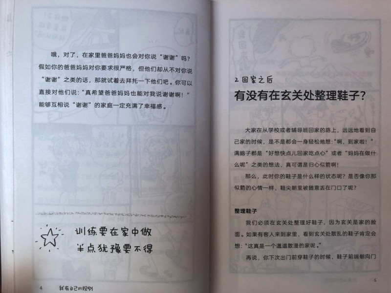 ![]() 问女儿什么才是长大之前,女儿说应该是五岁吧~哈哈,看来小孩子还是挺容易长大的~ ![]() 本书作者辰巳渚是日本百万畅销书作家,毕业于御茶水女子大学文学教育系。她一直致力于简易现代生活秩序的研究与实践,并且非常关注家庭教育,致力于对孩子良好成长环境的研究,著有《“扔掉!”技术》《帮助孩子成长的每日规则》《为了离家的日子》等多部畅销作品。“长大之前要做的事” 系列是根据其在日本三大报纸之一的《每日新闻》上的连载文章结集出版而成。 ![]() 《长大之前要做的事》一共有六册,作者辰巳渚在全系列六册书中,通过平等对话的形式逐一解答了孩子成长过程中多方面的疑问与困惑,并且给出了具体可行的建议和指导。 ![]() 全系列采用生活漫画与朋友式讲解相结合的形式,借助漫画主人公真纪成长过程中遇到的各种问题来提出一系列成长指南。 ![]() 用朋友对话式的语言更易被孩子接受,搭配小主人公真纪的搞笑生活漫画让孩子更有代入感。 ![]() 书中的内容均是站在孩子的角度思考问题,用简单易懂的语言深入浅出地分析说明问题。 ![]() 针对具体场景所提出的建议和行动指南具体可行,避开大而空的道理,从具体对策入手帮助孩子们树立自立意识、培养自立能力、学会独立思考,具有极强的可操作性。 ![]() 这套书的内容贴近生活,指导方法明确,让孩子更有代入感。 ![]() 整套书一共有428个日常生活场景,解决孩子在行为规则、情绪管理、人际交往、独立思考、等多方面的成长刚需。 ![]() 我们得到的是其中一本我有自己的规则~ ![]() 这本书中共有48个长大的自我约束法~ ![]() 虽然是日本的一些行为准则,但是很多道理和方法中国的孩子都非常适用~~ ![]() 书中按照春夏秋冬分了四个章节,当然和季节没有太多关系~ ![]() ![]() 开始看到这副图的时候也以为是按照季节来分,可能是和这个季节有关的内容,后来发现的确是没有多大的关系~ ![]() 在中国说谢谢也是基本的礼节,现在孩子大多数都还算有礼貌,能主动说谢谢,尤其是在外面,但是在家里能够主动说谢谢的孩子应该不算多,尤其是男孩子,估计很少男孩会主动和父母说谢谢,越大的男孩估计说得越少。而且父母说谢谢的几率也不多,其实这个和父母有很大的关系,如果父母能够经常说谢谢,孩子一定可以经常挂在嘴边的~ ![]() ![]() 不知道父母有没有观察过孩子回家后是否会整理鞋子。很多孩子回家后鞋子都是脱下来一甩,有些是东一只西一只,原来我女儿也不会整理鞋柜旁的鞋子,但是她脱下来的时候会摆放整齐,自己的鞋子会自己放好。但是有次去朋友家里玩,发现朋友妈妈会主动整理鞋柜旁的鞋子,后来有一段时间回家放鞋子也是特别整齐。如果孩子在外面拖鞋后将鞋子摆放整齐,会给客人一种很舒适的感觉。 ![]() 在中国现在很少有孩子会主动给客人倒茶了。也许是现在家里客人都越来越少了吧,现在家庭都是以一家三口为主,周末很多时候都出去玩,所以现在家里经常有客人的情况还是比较少的,而且即使来客人了,可能也是给一些饮料,很少需要给客人倒茶倒水了,即使有可能也是大人代劳了,其实可以让孩子试着做一些倒茶的事情,让孩子学会基本的礼仪` ![]() 关门的声音看起来是比较小的一件事情,但是也体现了很大的礼节。很多家长会在生气的时候将门关得很大声音,后来孩子学会了生气的时候也会摔门,所以在中国可以从关门声音判断孩子是否生气了 当然在平时我们也要注意开关门的声音,因为太大的声音不仅会干扰到别人,还会制造噪音~![]() 所以我们平时在开关门的时候要多一个小小的举动,只需要多一点动作,就可以避免这些噪音了` ![]() 在日本,垃圾分类是非常被重视的。而之所以能有很好的垃圾分类习惯就是从小就对孩子灌输要学会处理垃圾的问题。在日本孩子从小就学到不要随便扔垃圾,如果没有垃圾桶就要放在自己的口袋中。台湾应该也收到日本的这个影响,其实在台湾街道上,垃圾桶都不是太常见,就是避免人们到处扔垃圾~ ![]() 我家经常会发现厕所纸用完没有更换的情况。当然我有时候会在厕所多备几卷纸,但是一般都是我来更换。其实可以教导孩子让他们从小学会自己更换卷纸~ ![]() 随时更换已经用完的厕所纸不仅是有利于自己,还有利于家人方便。 ![]() 书中讲到的一些生活中的小细节可能家长们平时都不会太在意,但是细节本来就决定成败,所以从小细节出发,让孩子的好习惯能早点养成。 ![]() 通过这本书,女儿学到了不少好的习惯` ![]() 许多好习惯都是需要从小养成,孩子长大真是很快,有时候就是觉得一瞬间的事情,但是好习惯的养成可不是一蹴而就,好的习惯不仅对孩子将来学习能够有帮助,在孩子为人处世方面都有很大的优势~所以在孩子还小的时候,家长就努力让孩子完成这些本应该可以做的事情吧!
