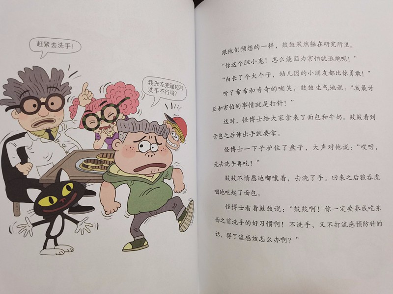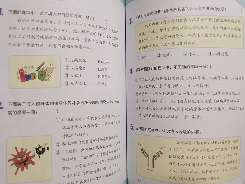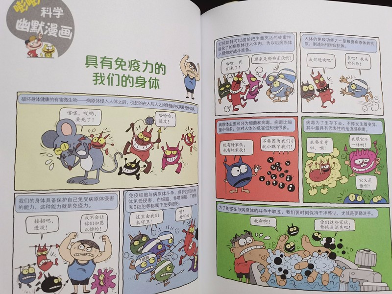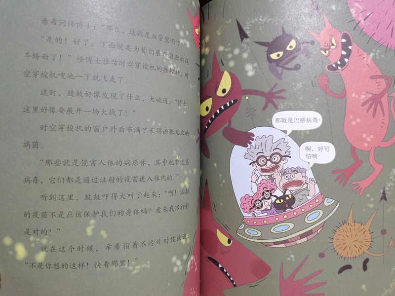 ![]() 打预防针是每个孩子小的时候都要经历的事情,小皮球的预防针从出生一直打到六岁,也就是上小学之前,当然随着年龄的增长打针的频率就没有刚开始那么多了。但是每次带小皮球去打针的时候都感觉是进了个大型菜市场,孩子们哭的闹的,吵的我一个头两个大。还好小皮球表现不错,基本上都没有哭的。偶尔有那么一两次,也就象征性的嚎一两嗓子,针拔出来就没事了。 ![]() 《稀奇古怪研究所》里的鼓鼓就是一个不肯打预防针的孩子,别看他个头比同龄孩子大,但胆子却出奇的小,用奇奇的话说,幼儿园的孩子胆子都比他大,娇小如希希这样的女生都很勇敢的去打了预防针,而他却因为害怕躲进了研究所。为了帮他克服心理上的障碍,奇奇主动提出愿意让教授和鼓鼓乘坐时空穿梭机进入自己的身体,让鼓鼓和我们近距离的观察进入身体的疫苗是如何工作的,了解了细胞们奋力保护自己所付出的艰辛,鼓鼓终于战胜了心魔,勇敢的去打了预防针。 没错,我收到的是《病毒军团和免疫细胞的战争》,从病原体、传染病、细菌和病毒以及免疫还有预防传染这几个方面着手,给我们介绍了相关的知识,也是看了这本书我才知道,原来疫苗打进我们的身体也是病原体,别怕,这些都是少量灭活的,或毒性弱化了的,进入体内不会对身体产生坏影响的,我们的细胞如白细胞、吞噬细胞、T细胞还有B细胞都属于免疫细胞,它们会吞噬这个病原体,然后产生相同病毒的抗体,这样下次身体再遇到相同的病原体时免疫细胞就会第一时间发现并消灭它们。这就是疫苗的工作原理,也是人体的免疫功能之一。 ![]() 病原体主要可分为细菌和病毒,虽然病毒比细菌小很多,但是对人体的危害却要强得多。我们平时喝的酸奶里的益生菌也是一种细菌,当然它是好的。而病毒为了生存下去,也是无所不用其极,它会不停的发生变异,其中最具有代表性的就是流感病毒了。曾经有一段时间我陷入了两难的境地,网络上太多关于疫苗出事的报道,很多孩子因为打了预防针而发生不好的事情,然后一个家庭就这么毁了。幸好小皮球的运气不错,疫苗没事。 为了帮助孩子们真正掌握病毒和免疫细胞的知识,在书的最后还出了几道选择题让孩子们做,万一不会做也没关系,也可以翻看一下正确答案,再重新回头做题,直至掌握为止,是一本值得推荐的好书。 ![]() ![]() ![]()