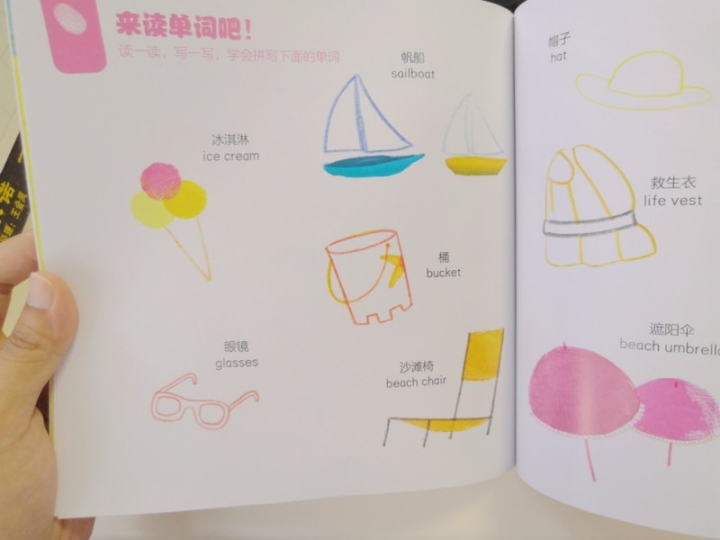 还有绘本中出现的各个东西的中英文的单词,通过这本书不仅可以学到指印画还可以学到英语,真的是太棒了