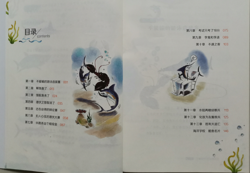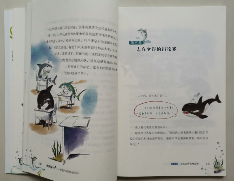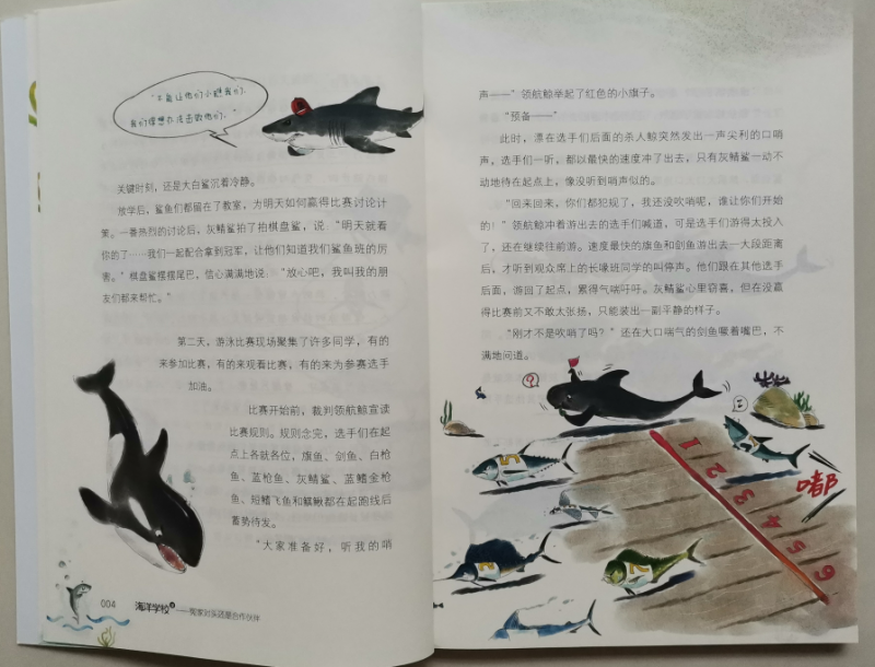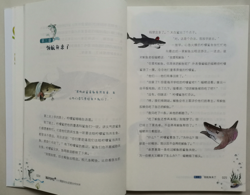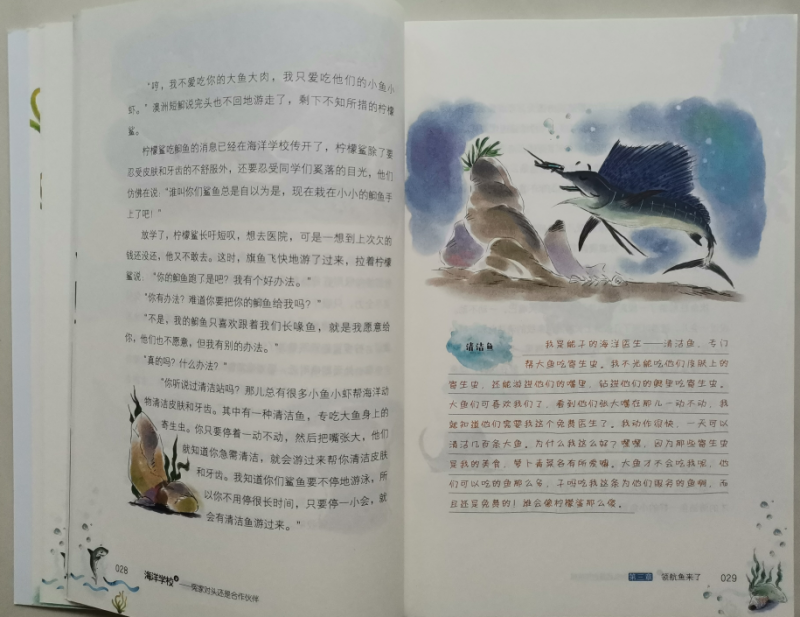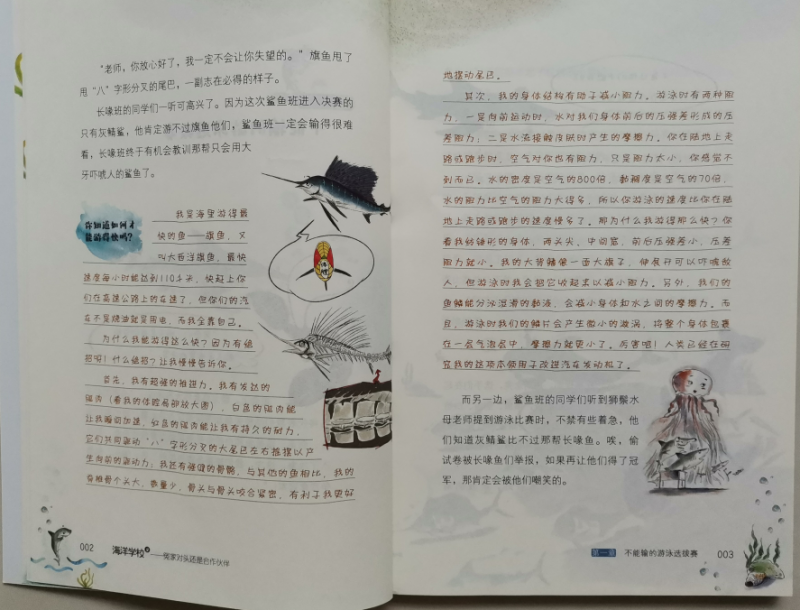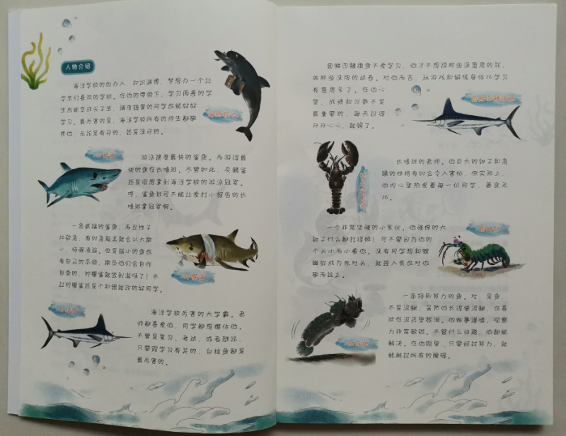![]() 海洋世界,是令人向往的神秘世界,海洋里有各种各样我们所不了解的生物,所以说到海洋,会让很多人感兴趣。曾经,带娃去过人造的海洋世界,透过玻璃看着各种鱼儿和不知名的生物,小朋友们都会惊喜不已,而且百去不厌的那种感觉。而这套《海洋学校》,除了让人对海洋生物有了更深刻的了解以外,最神奇的地方就是书中的每一种动物都被赋予了各自的特性,有自己的名字,还能开口说话,他们不再是单纯的生物了,这才是最吸引人的地方。 ![]() ![]() ![]() 《海洋学校》,被称之为爆笑校园海洋百科,整套书有两册,《鲨鱼班和长喙班的矛盾》、《冤家对头还是合作伙伴》,看书名是不是就觉得特别有趣。既然是学校,那当然就有各种班级了,比如:鲨鱼班、鱼宝宝班.....等等,他们也和普通的学生一样,需要做作业、参加考试,有各种课外活动,只是它们的学校在海洋里,是不是这么一介绍就更想一睹其内容呢。 ![]() 我们收到的是其中的一册《冤家对头还是合作伙伴》,翻开书的第一页,是“人物”介绍哦,有海豚校长、各种鲨鱼、还有从来没听过的各种虾,比如:螳螂虾,你见过吗?接下来就是目录,一共有十三章的内容,一看标题就觉得特别有意思,比如:不能输的游泳选拔赛,都是水里的生物,游泳应该是天生就会的吧,可是谁更厉害呢?看了标题就会特别想看看故事情节,看看谁才是真正的水中霸王。咱家弟弟指着目录里的:考试只考了18分问,哪条鱼考这么低的分呢,边问边直接去找相应的内容读上了。 ![]() ![]() ![]() ![]() ![]() ![]() 我也没忍住好奇,拿过书翻到了考试只考了18分的那节,在海洋学校原来生物们也和人类一样哦,对于期末考试既紧张又兴奋,紧张的是怕没考出好成绩,兴奋的当然是接下来的假期时间了。螯龙虾老师用大钳子发了试卷,而旗鱼呢看着卷子发愣,觉得哪道题都很难呢?最后还在考试的过程当中打了瞌睡,所以最后只能以18分收场了,甚至收到了老师的最后通牒,如果下次考试没有80分可就要退学了哦。不过小旗鱼呢妈妈却安慰他不用着急,有妈妈帮忙补课呢,肯定问题不大。看着这些小鱼儿的故事,是不是觉得很贴近小朋友们的日常呢,是不是觉得非常有趣呢。 ![]() 所以说,原来百科科普的海学校的故事原来也这么生动有趣,书中图文结合,虽然对咱家二年级的弟弟来说,没有拼音文字较多的书还是有点吃力,尤其书中的很多鱼儿的名字很多生字,甚至要查字典或去问哥哥,但一点都不影响他的阅读兴趣,因为故事情节够形象生动,能获得他的共鸣,而且故事中还穿插着许多科普知识点,能学习到不少的科普知识,非常有趣的一套海洋科普书。